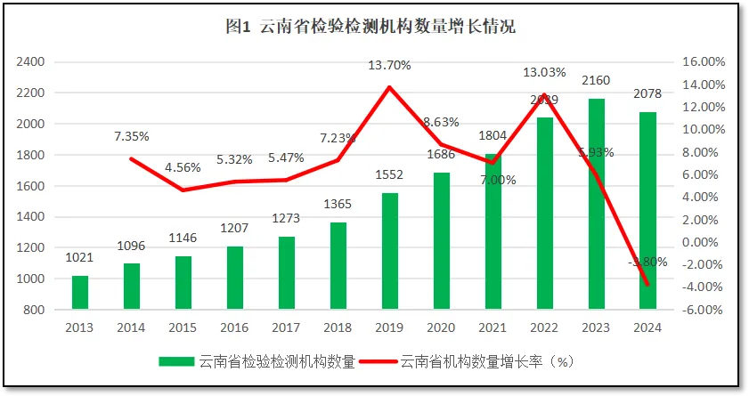 由图1可见,2023年之前,云南省检验检测机构数量持续保持增长,年均增长率为7.82%。2024年末,云南省的检验检测机构数是2078家,首次出现下降的情况,较2023年末减少约80家机构。从年度增长率曲线来看,2023年之前,云南省检验检测机构数量的增长率总体保持在较高水平,其中在2019和2022年有两次比较大的涨幅,分别达到13.7%和13.03%。2022年以来,云南省检验检测机构数量增长率下降很快,2024年跌入负值区间,增长率为-3.8%。