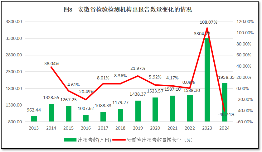 从图8来看,除了2013年之外,从2014年到2022年,安徽省检验检测机构对外出具的检验检测报告数量总体变化不大,主要在1千万到1.5千万之间波动,年均增速为2.92%。但是,安徽省检验检测机构在2023年出具的报告数量陡增,达到3304.78万份,是历年来的最高值。2023年安徽省检验检测机构出具的报告数量是2013年出报告数量的3.43倍。不过2024年度安徽省检验检测机构出具报告的数量又大幅回落,降到了1958.35万份。从这一数据变化情况来看,2023年度安徽省检验检测报告数量的数据可能存在较大统计误差。从增长率曲线来看,安徽省检验检测机构出具报告数量的年均增幅为11.7%,年度最高增幅出现在2023年,达到108.07%的增幅,最低出现在2024年,为-40.74%。